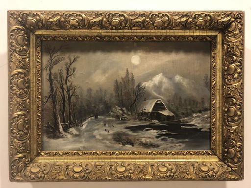 19th Century Oil On Board Snowy Cabin In The Woods Unsigne