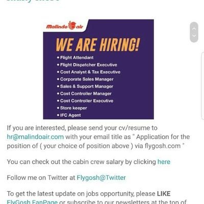 You can check out the cabin crew salary by clicking here follow me on twitter at flygosh at twitter as you may already be aware that i have max out my facebook 5000 friends limit therefore to continue to get updates on latest news and jobs opportunity for both pilots and cabin crew you can like the fly gosh fan page by clicking here.